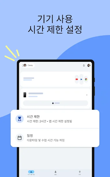 • 기기 사용 시간 제한 설정: 자녀에게 가장 적절한 기기 사용 시간을 찾아보세요. Family Link를 사용하면 자녀의 기기에 수업 시간 및 다운타임 일정을 포함한 일일 시간 한도를 설정할 수 있으므로 자녀가 균형 잡힌 기기 사용 습관을 들이도록 도울 수 있습니다.