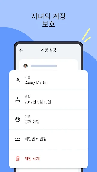 • 자녀의 계정 보안 설정: Family Link를 사용하여 자녀의 계정 및 데이터 설정을 관리할 수 있습니다. 부모는 자녀가 비밀번호를 잊어버린 경우 변경 또는 재설정하거나, 자녀의 개인 정보를 수정하거나, 필요한 경우 자녀의 계정을 삭제할 수 있도록 도와줄 수 있습니다.*