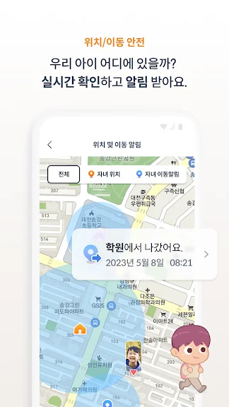 위치 기반 알림: 아이가 특정 장소(학교, 집, 학원 등)를 출입할 때 알림을 받을 수 있습니다.