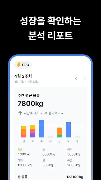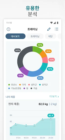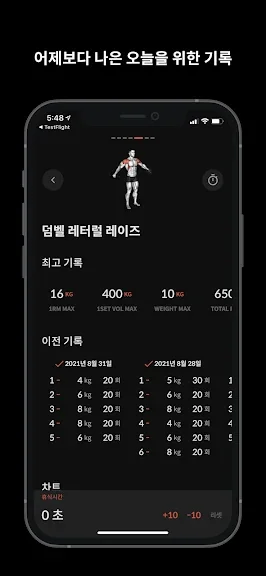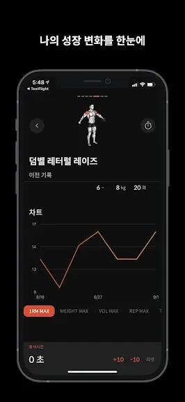 - 기록된 운동 데이터를 바탕으로 막대 차트와 선 차트를 통해 진도를 추적하고, 목표 달성을 도와줍니다.