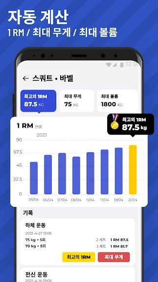 - 1RM 계산 기능을 통해 자신의 운동 능력을 확인하고, 맞춤형 루틴으로 한계를 도전할 수 있습니다.