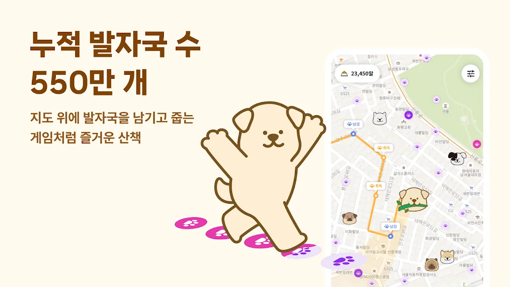 산책을 하면 350m마다 자동으로 발자국이 찍혀요.