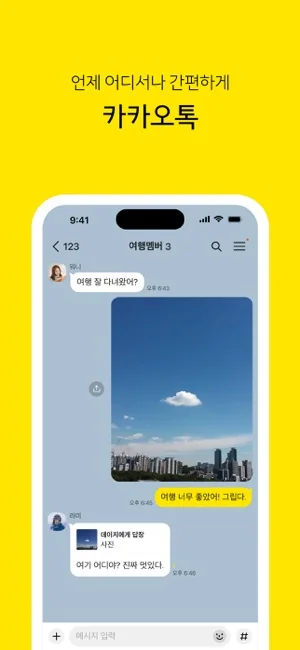 카카오톡을 설치한 친구들간에는 국내뿐 아니라 해외에 있는 친구들과도 무료로 채팅을 즐길 수 있습니다. 기본적인 1:1 채팅뿐 아니라, 그룹 채팅을 통해 여러 친구들과 동시에 메시지, 사진, 동영상, 음악, 연락처 등을 간편하게 주고 받을 수 있습니다.