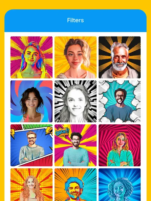 이 사진 편집기를 사용하여 전문가처럼 몇 초 만에 직접 만화에 도전해 보십시오. 사진 갤러리에서 달콤한 셀카 하나를 선택하고 멋진 3D 만화 캐릭터 메이커를 위한 수많은 캐리커처 얼굴 앱 필터를 적용하세요. 얼굴을 사랑스러운 애니메이션 영화 캐릭터로 쉽게 바꿀 수 있습니다. Instagram, Facebook, WhatsApp, Pinterest 및 TikTok에서 친구를 놀라게 할 준비를 해보세요.